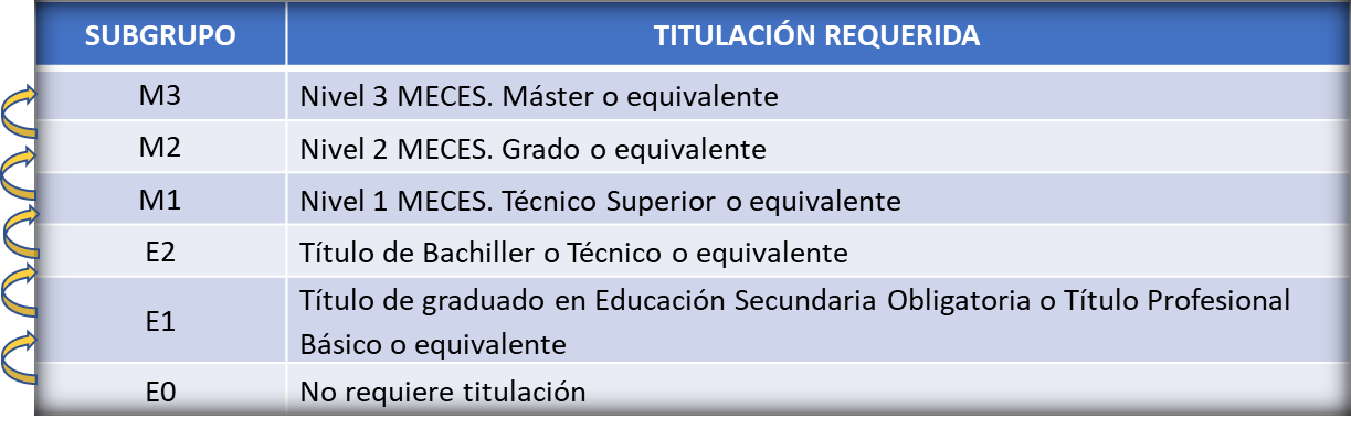 Addicionalment, el personal funcionari es classifica en grups (Grup A i C), i dins d'aquests, en subgrups (subgrups A1, A2, C1 i C2), en funció de la titulació requerida per a accedir: